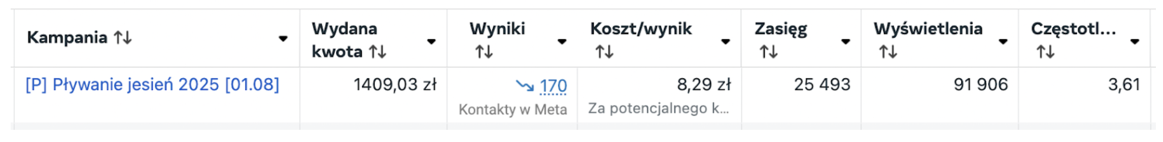 Szkoła nauki pływania ma swoją stronę internetową z opisem oraz harmonogramem zajęć, natomiast do rezerwacji i zakupu kursów służy zewnętrzny system, w obrębie którego nie jesteśmy w stanie odczytywać danych o konwersjach – z tego względu najlepszym rozwiązaniem była kampania Meta Ads na pozyskanie leadów kierowana do rodziców dzieci. W innych przypadkach występowałaby trudność z optymalizacją skuteczności kampanii.