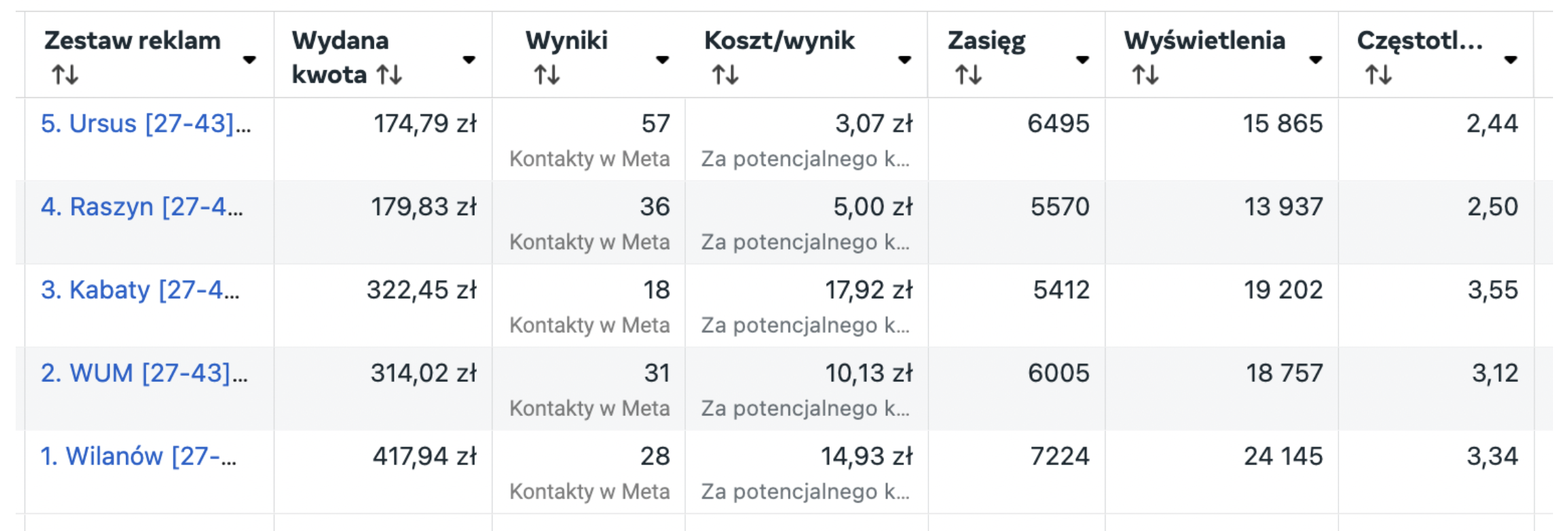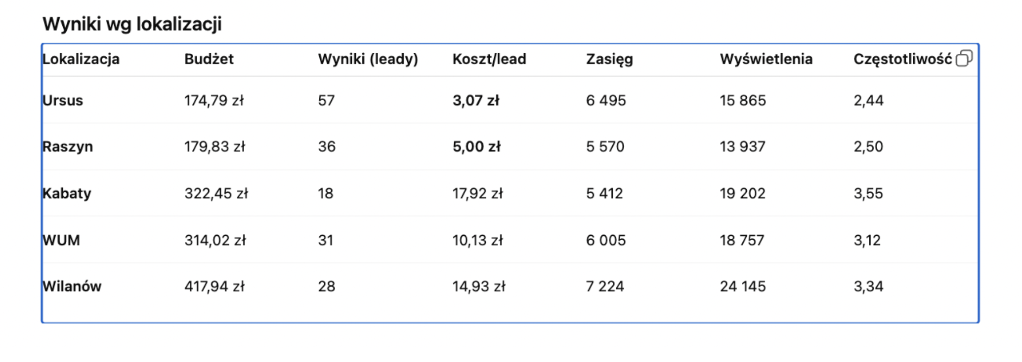 1. Skalowanie zestawów reklam na Ursus i Raszyn – to lokalizacje z najlepszym ROI, warto byłoby zwiększyć tam budżet, aby wygenerować jeszcze więcej tańszych leadów – oczywiście pod warunkiem, że nie zapełniłaby się lista zapisów.